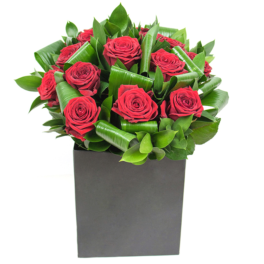 Bring elegance and charm to any room with our captivating bouquet, featuring lush red roses, vibrant aspidistra leaves, and delicate ruscus. Each flower is handpicked to ensure exceptional quality and lasting freshness.
